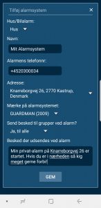 Alarmens telefonnr: Her er det vigtigt at du angiver telefonnummeret på det simkort der sidder i dit alarmsystem (kontakt os hvis du ikke ved hvilket nr dit alarmsystem har)